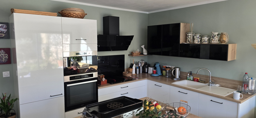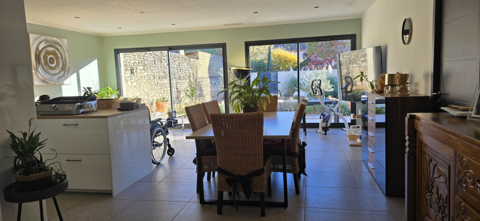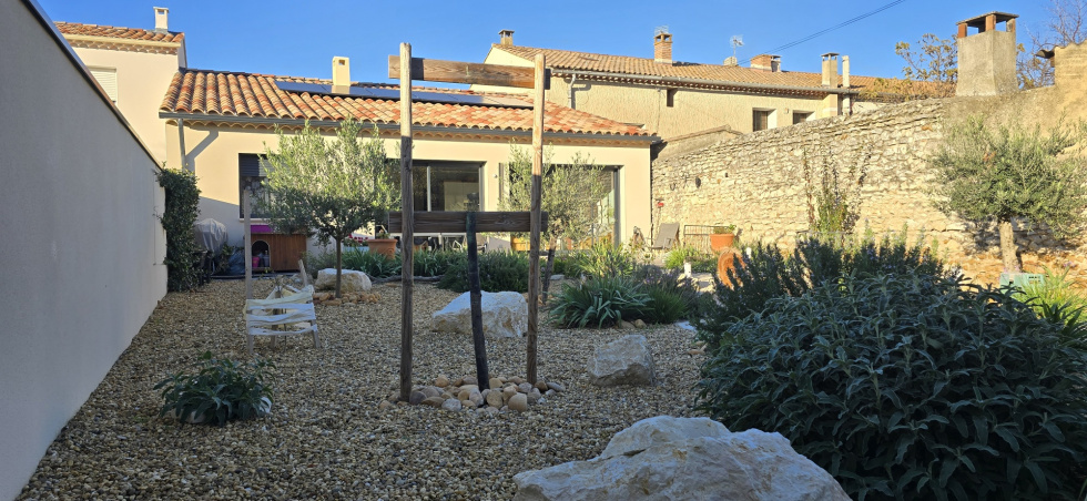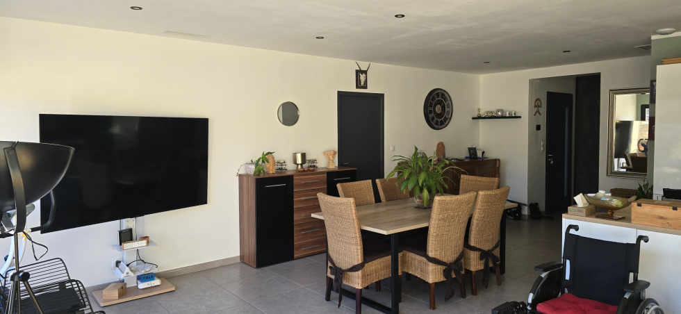 MAGNIFIQUE VILLA NEUVE PLAIN PIED ANNEE 2024 RT 2020 CENTRE VILLAGE EXPOSEE SUD SANS VIS A VIS SANS NUISANCE , PRESTATIONS HAUT DE GAMME , SH 92 M2 + GARAGE PORE SECTONNELLE AUTOMATISEE 19 M2, TERRAIN 374 M2. PARKING INTERIEUR 1 VOITURE AVEC PRISE ELECTRIQUE, PORTAIL ALUMINIUM, HALL SEJOUR SALON 2 BAIES ALU CUISINE US AMENAGEE EQUIPEE ILOT CENTRAL ( FOUR PLAQUE INDUCTION HOTTE ASPIRANTE MICRO-ONDES LAE-VAISSELLE FRIGO) CELLIER/BUANDERIE CUMULUS THERMODYNAMIQUE, CHAMBRE PARENTALE DRESSING PRIVATIF SALLE DE BAINS COMPLETE (DOUBLE VASQUE BAIGNOIRE D'ANGLE DOUCHE ET WC), WC LAVE-MAINS, 2EME CHAMBRE AVEC PLACARD. CHAUFFAGE POMPE A CHALEUR GAINABLE, PANNEAUX SOLAIRES ELECTRICITE 73€/MOIS, FIBRE. TAXE FONCIERE 997 EUROS/AN.